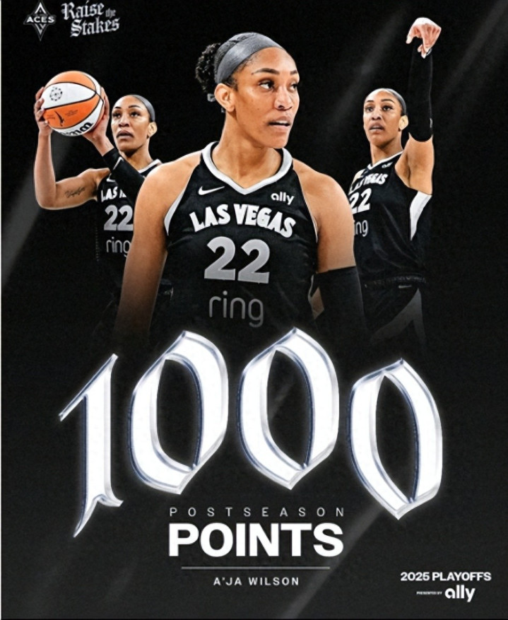 阿贾-威尔逊季后赛总得分达成1000分里程碑,成为季后赛历史第7人。